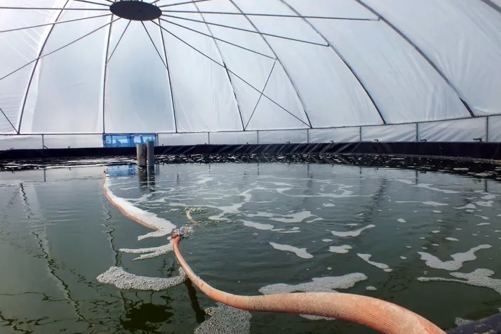 Nếu bạn sử dụng ao lớn, nên đặt ống thoát nước dưới đáy giữa ao để thỉnh thoảng loại bỏ bùn thải. Điều này đặc biệt quan trọng khi bổ sung carbohydrate một cách thường xuyên. Tùy chọn thứ hai là sử dụng lò phản ứng biofloc để tăng tốc chuyển đổi bùn ao thành flocs.
