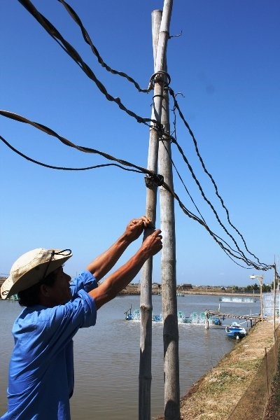 Nông dân ĐBSCL phải tự đầu tư lưới điện hạ thế phục vụ nuôi tôm bằng phương tiện rất thô sơ. Ảnh Ngọc Tùng