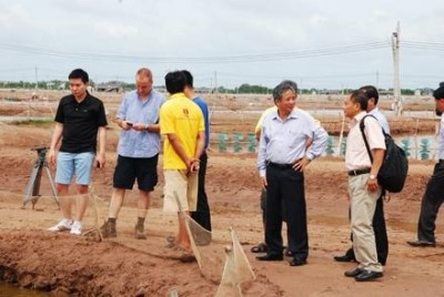 Các chuyên gia kiểm tra thực tế các vùng nuôi tôm thực hiện BHNN tại đồng bằng sông Cửu Long. Ảnh: HỒ HẢI ÐĂNG