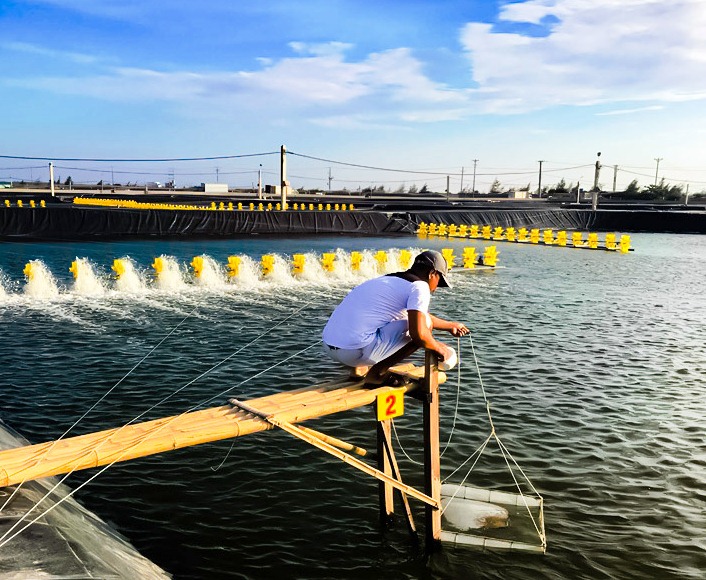 Anh Hạnh đang kiểm tra ao nuôi tôm