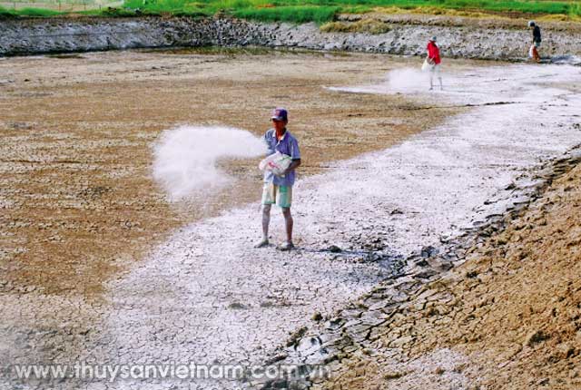 Bón vôi khi cải tạo ao: Để xác định chính xác liều lượng vôi cần bón cho từng trường hợp của đáy ao có thể áp dụng phương pháp thử với dung dịch đệm p-Nitrophenol pH=8 (hòa tan 10 g p-nitrophenol, 7,5 g H3BO3, 37 g KCl và 5,25 g KOH trong nước cất rồi pha thành 1 lít). Cho 20 g bùn khô đã được nghiền mịn vào 40 ml dung dịch đệm p-nitrophenol, khuấy đều vài lần trong một giờ, sau đó đo pH của dung dịch (pHdd) và xác định lượng vôi cần bón theo công thức sau: