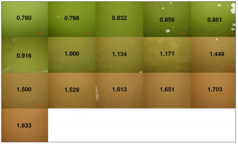 Màu vàng nâu (màu nước trà): Do sự phát triển của tảo silic (Bacillariophyta), loài tảo này thường phát triển mạnh ở môi trường nước lợ, mặn vào đầu vụ nuôi; đây là màu nước thích hợp nhất để nuôi các loài thủy sản nước lợ, mặn.