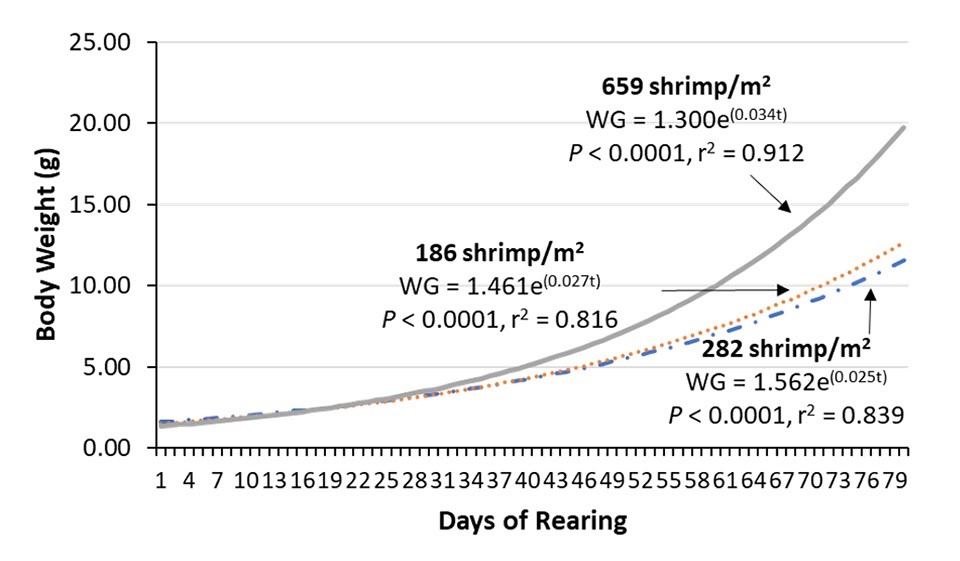 Năng suất tôm cuối cùng tăng tuyến tính như là một hàm của mật độ tôm ban đầu. Mối tương quan giữa ngày nuôi và tất cả trọng lượng cơ thể của tôm thu thập trong các thử nghiệm chỉ ra rằng, với mật độ nuôi dưới 659 con tôm/ m2, sự tiến triển trong hoạt động nuôi, tăng trọng lượng cơ thể tôm vẫn được được duy trì trên các mật độ khác (quan sát hình 1).