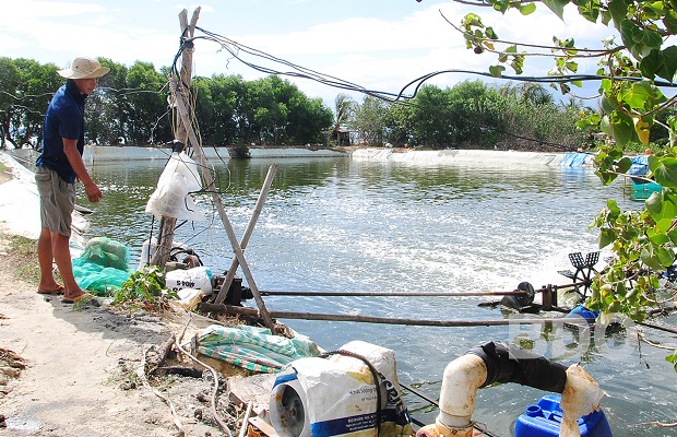 Các hộ nuôi tôm ở xã Nhơn Hội (TP Quy Nhơn) thay nước ao nuôi chăm sóc tôm trong vụ mới