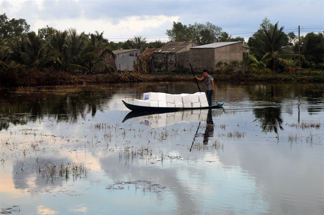 Những ngày này, đi dọc theo những cánh đồng ở các huyện vùng U Minh Thượng (tỉnh Kiên Giang), lúa thu hoạch đã vãn. Các cống ngăn mặn ven biển đã được mở toang cho nước biển đổ vào những nhánh sông. Tiếng máy nổ vang, hút nước từ tuyến kênh, mương đổ vào ruộng lúa vừa thu hoạch xong. Nông dân ở đây quen gọi đó là vuông tôm. Ruộng kề ruộng, mênh mông như biển nước. Người chống xuồng, người tạt vôi, hóa chất để xử lý, tạo màu nước chuẩn bị đón tôm giống về thả nuôi.