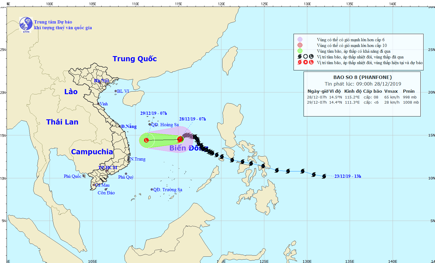 Hồi 07 giờ ngày 28/12, vị trí tâm bão ở khoảng 14,5 độ Vĩ Bắc; 115,2 độ Kinh Đông, cách quần đảo Hoàng Sa khoảng 360km về phía Đông Đông Nam. Sức gió mạnh nhất vùng gần tâm bão mạnh cấp 8 (60-75km/giờ), giật cấp 10. Bán kính gió mạnh từ cấp 6, giật từ cấp 8 trở lên khoảng 120km tính từ tâm bão.