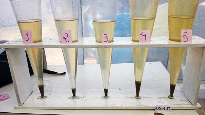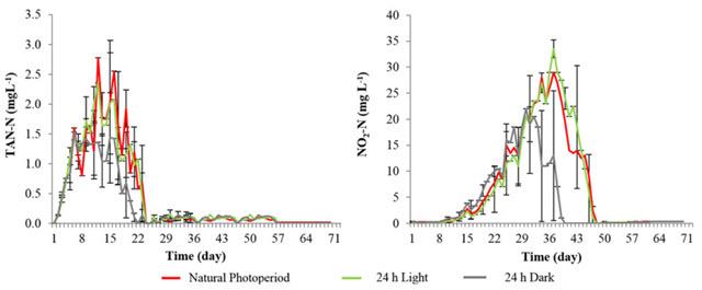 Tuy nhiên, có một sự khác biệt đáng kể về tổng nitơ amoni (NH3) và nitrit (NO2) và chất diệp lục. Mỗi khi nồng độ nitrit vượt quá 25 mg/L, 20% thể tích nước trong bể được thay, đặc biệt là trong các chế độ tiếp xúc với ánh sáng (T2 và T3).