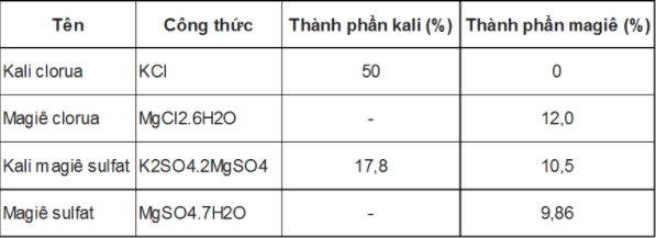 Nồng độ thấp của kali, đôi khi là của magiê có thể ảnh hưởng xấu đến tỷ lệ sống và tăng trưởng của tôm khi nước ao nuôi có độ mặn thấp. Người ta thường sử dụng các muối khoáng như kali clorua (KCl), kali magiê sulfat (K2SO4.2MgSO4), magiê sulfat (K2SO4.2MgSO4) hoặc magiê clorua (MgCl2.6H2O) cho các ao nuôi tôm có độ mặn thấp (Bảng 1).