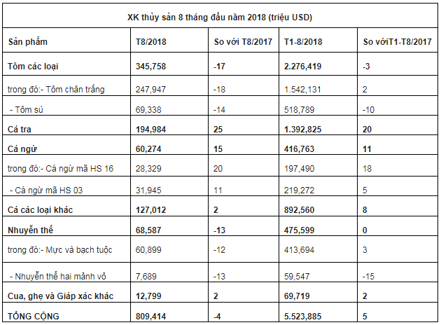 Theo thống kê Hải quan, XK thủy sản của Việt Nam tính đến ngày 15/8/2018 đạt 5,09 tỷ USD, tăng 6,4% so với cùng kỳ năm ngoái. Ước XK thủy sản 8 tháng đầu năm sẽ đạt khoảng 5,5 tỷ USD, tăng 5% so với cùng kỳ năm ngoái.